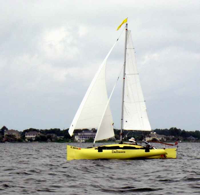 A gentle bumping woke me just before 6 a. m. The wind had all but died and gone from the southeast to the west southwest, leaving Oaracle nudging the shore. The anchor was reset quickly and the promised big breakfast - oatmeal and instant eggs! - was suitably enjoyed. Scott Gosnell called. He had stopped with a group that included Scott Widmier and John Bell - a friend from past Florida 120s and Everglades Challenges - between Pensacola Beach and Navarre Beach. I had gone by them in the night. There was an interesting small trimaran anchored nearby, which I correctly surmised from a fellow 120 participant. Dalliance was modified from a Chesapeake Light Craft proa design by her builder and owner, fellow Tallahassee resident Ron Falkey.