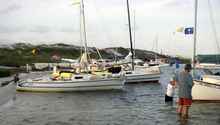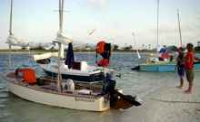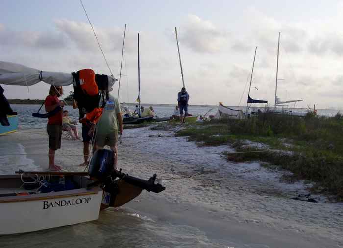 But what a short jaunt it was! The winds were up a bit and there was a bit of a sea running in the inlet. We swooped over the waves at between 6 and 6.5 knots, and admired a Sea Pearl (sorry, I missed the crews' names) as it came passed by us in the tumult. We got to Sand Island around 5. It was good to relax after the long day of great sailing. Several sailors collaborated to fix the separated centerboard pennant on Charlie McLemore and Izzie Lussier's Compac Horizon and there was much walking the shore, admiring of boats and general chatting.