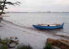 I've always enjoyed night sailing, but this night was turning out to be special. Pleasant temperature, ideal winds for Oaracle, easy navigation with well spread out channel markers (most with flashers), and no unexpected shoals. The lights of Pensacola Beach's hotels and condos faded astern as the lights of Navarre Beach's condos rose ahead with nothing in between on the barrier island. Despite a long day that included half a day at work and a four-hour drive to Shoreline Park, the sailing was refreshing. The isolation was near complete. Only two powerboats went by. As Navarre neared, I angled southward out of the marked channel to make for the beach where I planned to anchor for the night. Not long afterward, a tug and its string of barges went by in the channel; an impressive sight at night and one I was glad to view at a distance. Around midnight, Oaracle nosed to the beach at Navarre, next to Juana's restaurant, famed in FL 120 lore.