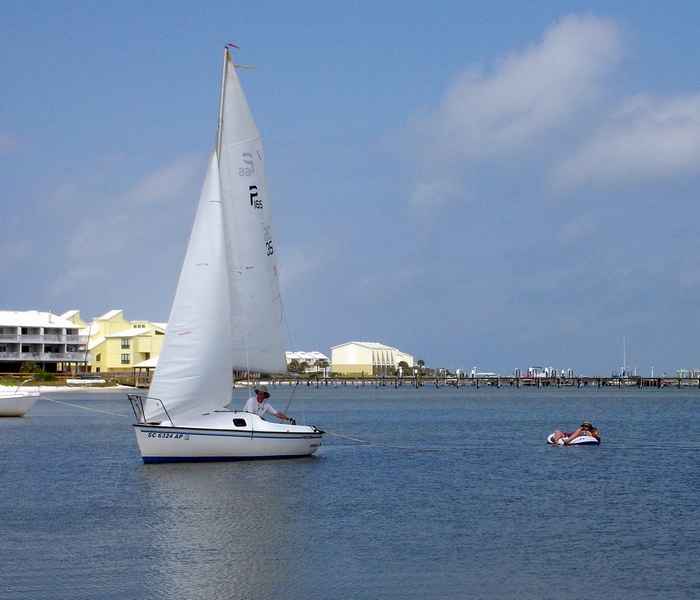 A Hobie and a 22 foot boat from fellow 120ers went by and I sailed for a bit with Scott and Fiddelsticks. The wind picked up so we were doing around 5 knots as we approached the Navarre Beach bridge. To commemorate that this was a cruising event, I decided to stop again and pick up some snacks and an extra gallon of water. Several other boats paused too, including Brett Hahulski with his 16 foot Precision. He was towing his crew, Chip Doneth, on an inflatable tube. It as a rather noteworthy entrance.