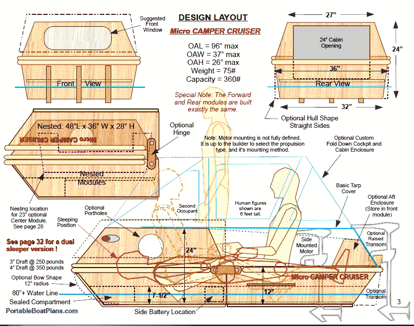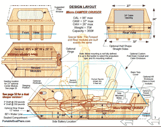 The beauty of the design is that it is adaptable. The builder has a clean sheet to make improvements, add use-specific fixtures, and even scale it to their transport needs and creature comfort wishes. The following is the Design Page of the plans, which provides dimensional information, as well as hull form options.