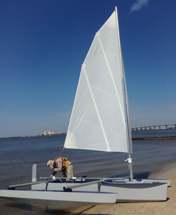 Frank has some clever mechanisms for unfolding the amas and raising the mast so you can just launch one of his modified designs and go. However, where I sail there are lots of ramps, but very few which will let you get to sailing water without an engine. Plus, there's no way to board one of these boats from a pier, and the ramps around here are usually steep and slippery. The beach which is plentiful with easy access to sailing water is blocked off which prevents trailer access but there's plenty of room between the poles to wheel the 24 inch wide main hull. So, I opted for the ability to assemble the boat on the beach which worked great. It took literally only 5 minutes to assemble the boat once I'd walked the components out to the beach, and that was the first time I'd done it.