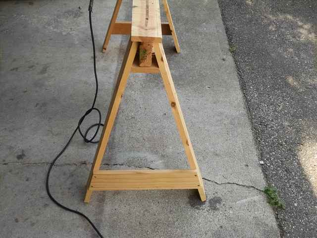 The I-beam works out nicely for attaching the legs (also 1x4) so that they are splayed outwards for strength and stability. Simply place the top end of each leg against the underside of the top flange and attach well to the web and lower flange. I used long construction screws, but have wondered if carriage bolts with wing nuts would make stable, collapsible horses. I cut the top ends of the legs at a slight angle so that the legs would splay outward in both directions (left/right and fore/aft). Another piece of 1x4 braces the legs at either end lower down to the ground to keep them from spreading.