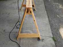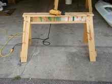 Side view of the sawhorses' construction. In addition to the added strength and stability of the splayed legs, they also allow the horses to stack nicely for storage. |