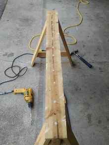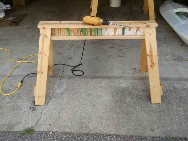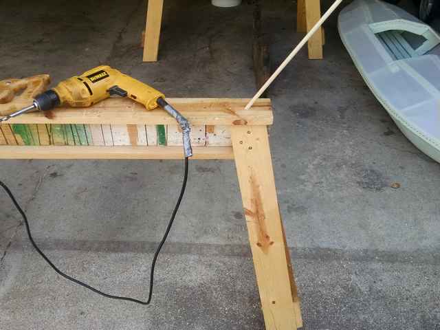 You might notice in the last photo that my dowels are all in a pretty straight line and really only angled in one direction (fore and aft). It would be better to give them two dimensional angles, some going in angled left to right, some right to left in this end view. However, given the relatively thin 2x4 web, I really couldn't do much. As such, the tops may rock side to side slightly and are probably more likely to break off with side to side forces than end to end forces. Perhaps I'll pick up some 1/4 inch dowels and add more with side to side angles.