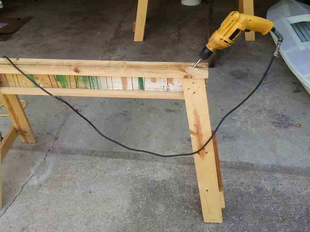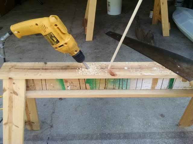 Now on to the doweling! I chose to use 3/8 inch dowels for attaching the top because... I don't know, that just seemed like a good size. I also happened to have a long 3/8 inch auger bit (seen in photo 2) which would work well for drilling the holes. I started at one end of the horse and drilled in at an angle: