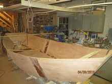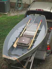 Something that attracted me to Warren's design is that I knew it would be rather quick and easy. With 5 panels to stitch up and everything wide open, easy to get to, this boat will get you to the water quickly. The only thing that slowed me down at all in building were the side tanks. I had put such things in boats before and had to do the usual (for me) "on the fly" engineering. Warren has a drawn an option for these tanks (plans page 30). It would be good to install some watertight hatches so you can use this area for storage. I believe if you placed the hatches just right and they were rectangular shaped you could get a pair of those cheap, breakdown oars in there as backups. You know the kind. They come with the "blow up $59.00 fishing boats". My brother took one on his honeymoon to FL. Thought he was really going to fish in it. But that's another boat story.