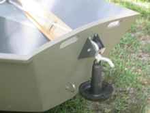 I did some extra stuff to accommodate the conditions. Treated Pine runners on the bottom. I had some Kevlar felt laying around so it went on the chines and at the base of the bow. The casting brace folds down. The seat was inspired buy ones I had seen on boats “out west”. It was a pain to build but very comfortable. Either seat can sit anywhere on the rails, friction fit. The anchor trolly was inspired by the $100. store bought ones. It’s just piece of AL tube, modified and a rubber roller, modified. Jam cleat to hold the anchor rope. Worked good. Small anchor was all that was needed in a 2-4 mph. flow. I generally coat the interiors of fishing boats with truck bed liner (Al’s brand) and it was just right for this drifter.