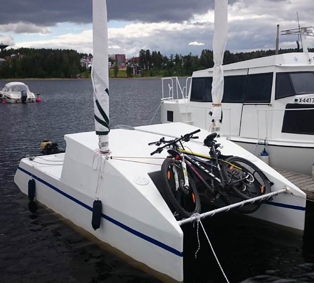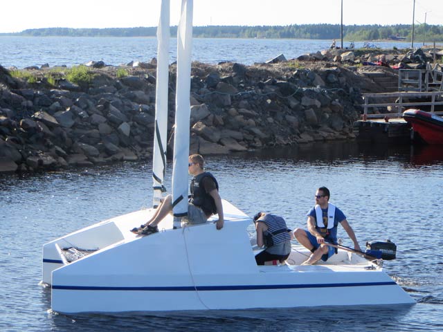So the boat "Aurora" went to the water a couple of days ago. I have only done short trips with it, but it feels really good. At first sail we had a motor breakdown and had to come back to dock with sails only. A little scary thing to do with a completely new boat that you don’t know how it’s going to behave. It went really smoothly and I could immediately see the advantages of furling mainsails. We approached the dock with only one sail and gradually furled it in thus controlling the speed accurately. At that point I knew I had made the right decision with the boat. Right now I have only experimental polytarp sails without any shape or camber, just made them with straight cuts during an hour for testing how the furling system works and where to put the cleats etc. But they already move the boat in light wind, so I’m pretty sure that boat is moving very well with properly made sails. The space outside is enormous for this size boat. I can easily carry two mountain bikes on the bow net without affecting usable space on the boat during sailing. The same would require a very, very big monohull. The rudder system is modified from the Storer rudder system, it’s a combination of dagger rudder and kickback rudder. I think it’s a perfect solution for a small sailboats rudder. The rudder blade is made per the plans and I think that is also the best way to make a rudder. Basically the structure is bending plywood on a simple jig, inside is a stringer and carbon fibre for strengthening. This produces a very light, rigid and exactly shaped rudder.